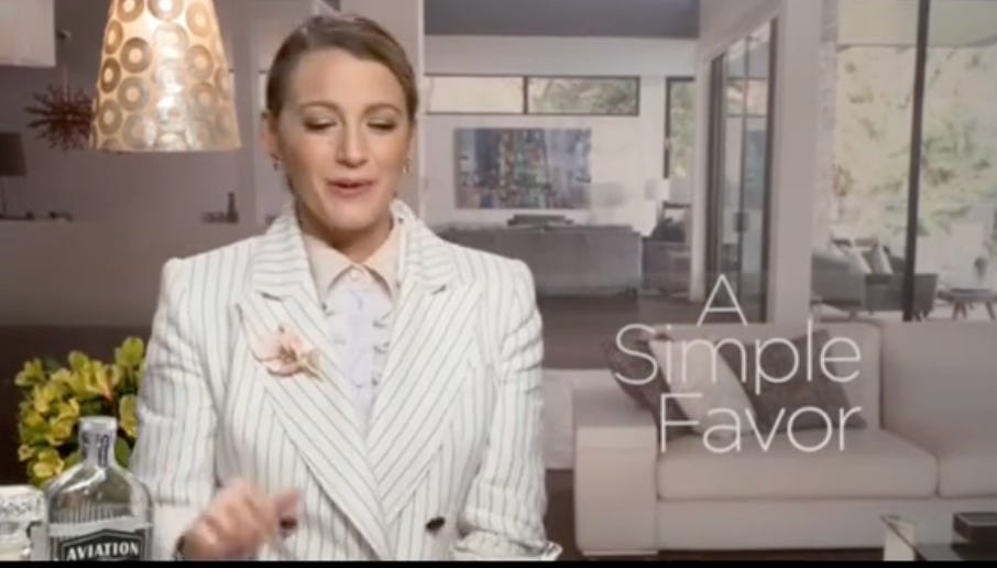 I thought 1 was bad, but I think interview No. 2 is worse (you be the judge). Here, we have a sober Blake forcing her husband’s stupid gin down a reporter’s throat. There are three reporters in this video, in fact, but it’s the first that really gets the short end of the stick. Blake hijacks an A Simple Favor press junket to make it all about Aviation Gin. After openly stating that she doesn’t drink, she proceeds to tell a reporter to drink up, while going on a three-minute tangent about the formulation of the gin without juniper berry, and all the taste tests it’s won. And how she doesn’t like coffee either, but she loves the story of how it’s crushed up from beans. If you’re lost, it’s OK, I think we’re supposed to be. Her interviews are like the tail end of a sporting event when you’re trying to run down the clock so there’s real purpose except to kill time.